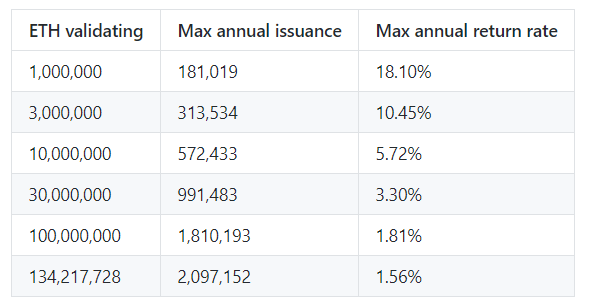 An increasing “max annual return rate” as the amount of “ETH validating” decreases acts as an incentive for more people to participate in staking when proof-of-stake is launched—a design that’s important for security, said one commenting developer.