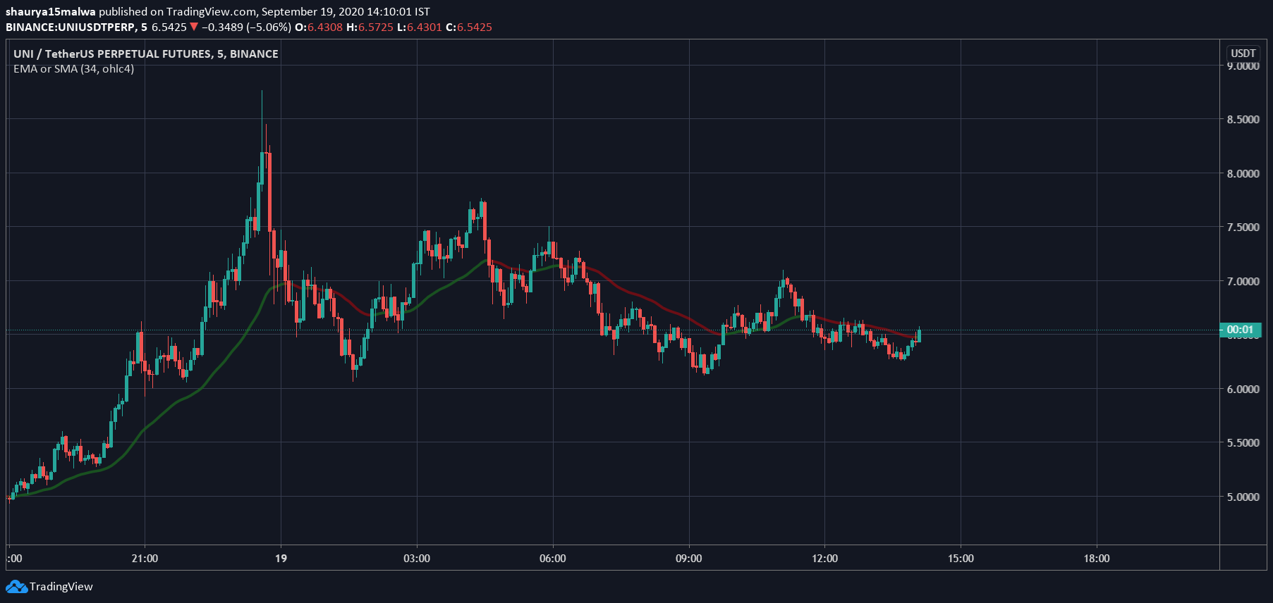 The token briefly traded at under a dollar, as per data on CoinGecko, but surged shortly after to $2.4. Investors then piled into the token over the next two days, with UNI briefly trading at over $8.40 on Friday night — a rise of over 500%. It trades at $6.32 at press time.