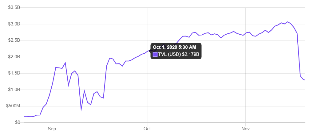 Data on the tracking website DeFi Pulse shows the characteristic “rug pull” formation for Uniswap’s liquidity data. Its total value locked (TVL) grew steadily over the past year to a high of $3 billion this year, but since dropped off a cliff to levels seen in early September.