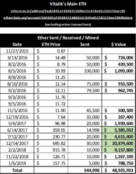 Sunnarborg links current ether prices against the timing of transactions into and out of Buterin’s wallet address. Based on these data, Sunnarborg estimates that Vitalik received $49 million for the sale of 545,000 ETH since March 2016.