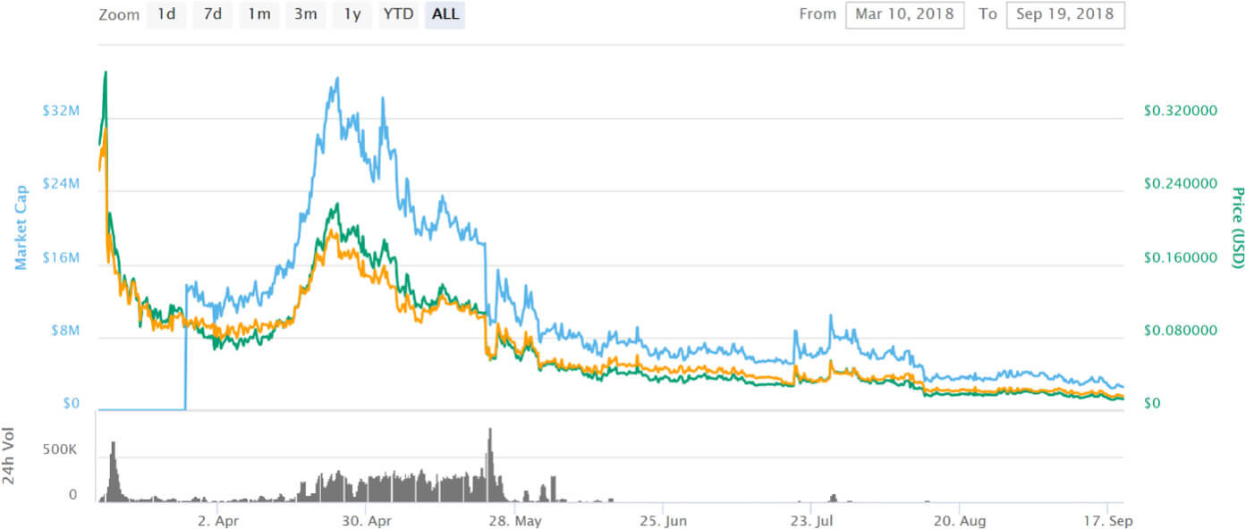 But there’s more. Legitimate ICOs have had a hard time delivering on their promises as well. Here’s a (typical) chart showing the trajectory of one such over-hyped ICO, which raised $30 million in January of this year.
