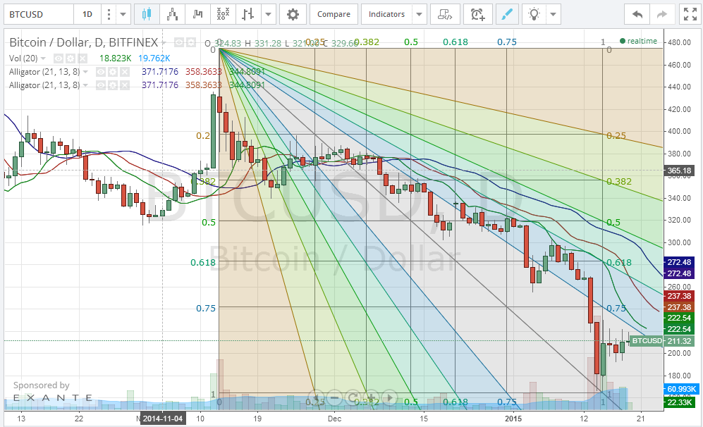 By plotting the Fibonacci retracement fan on the 1 day Bitfinex BTC/USD charts from tradingview.com (look at the below chart), we can see the price advancing towards the 0.75 fan line, while gaining support at the 1.0 fan line. Bitcoin traded around $212 at the time of writing of this article and the market seems to me moving sideways in an attempt to correct the price.