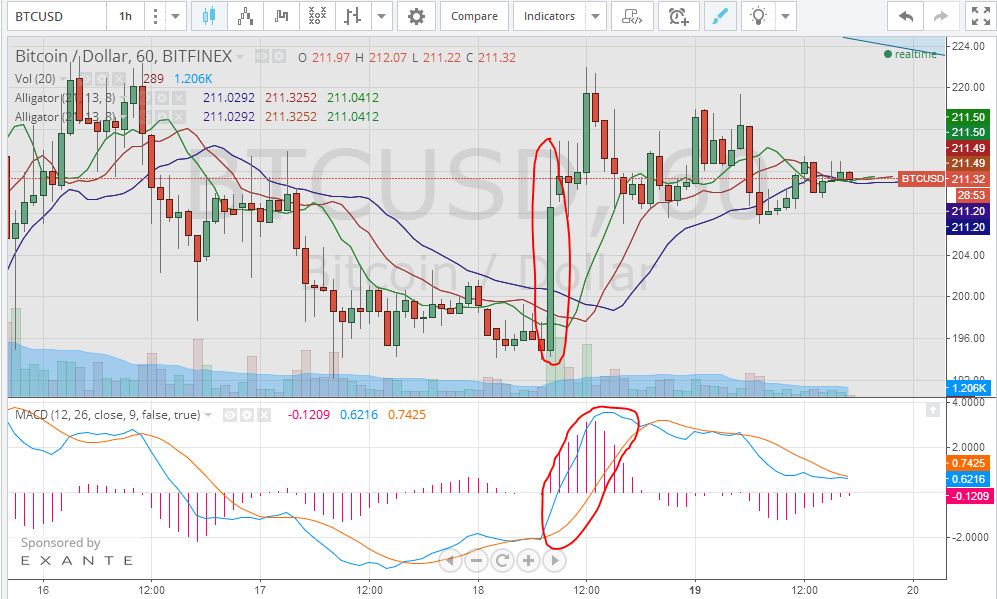 By plotting the MACD curve on the 1 hour Bitfinex (BTC/USD) charts from tradingview.com; we can see the blue MACD line crossing above the red signal line yesterday, which slightly preceded the rise from $196 to around $220. However, at the moment of writing of this article, the blue MACD line has crossed below the red signal line, which means that the bullish wave has weakened as the trading volume dropped today.