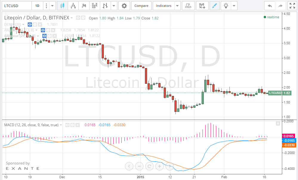 By studying the 1 day Bitfinex (LTC/USD) charts from tradingview.com and plotting the MACD indicator accordingly, we can see how litecoin price has been moving sideways to the $1.85 support level since the 28th of January. By analyzing the MACD indicator we can conclude that conditions are in favor of a rise in litecoin price that can push the price above $2.00 within the next 24 hours, as shown by: