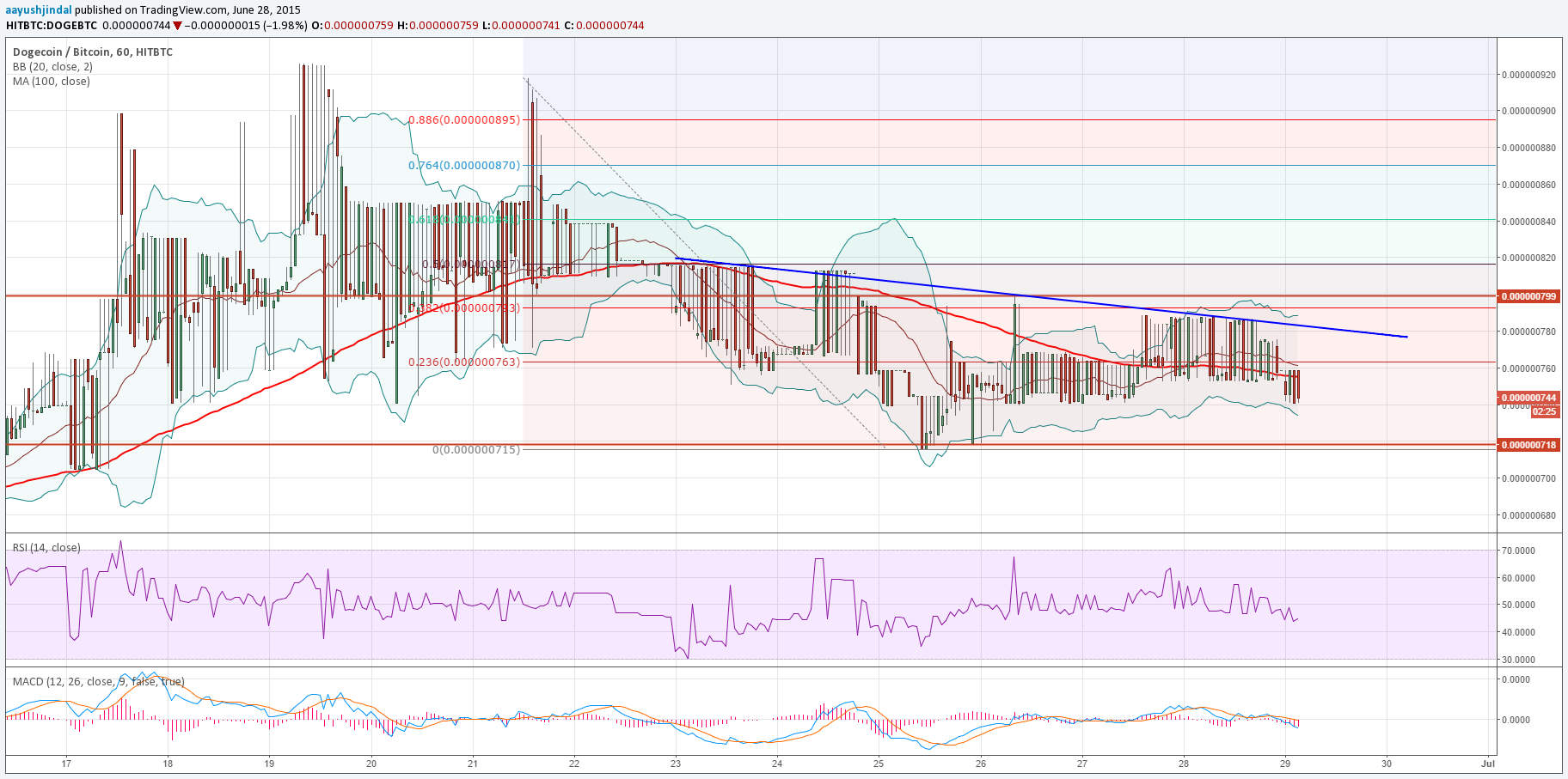 Dogecoin buyers managed to take the price higher on many occasions, but they failed to break a critical resistance area around 78.0-80.0 Satoshis. There is a bearish trend line formed on the hourly chart, which stalled the upside. Moreover, there were failures around the 38.2% Fib retracement level of the last drop from 91.8 Satoshis to 71.8 Satoshis. There is a major catalyst for Dogecoin price is the form of the 100 hourly simple moving average. It acted as a support and resistance on many occasions.