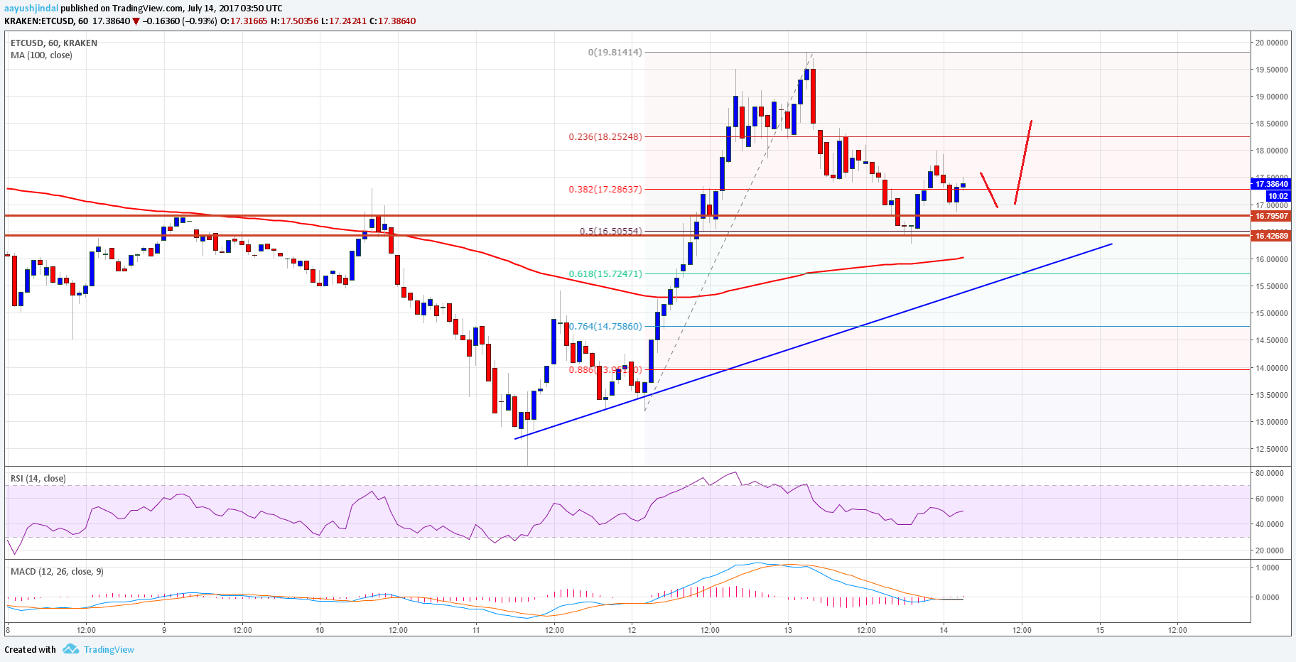 During the past two days, there was a lot of action in ETC price as it moved above $19.00 against the US Dollar. The price traded as high as $19.81 where it faced sellers and started a correction lower. The price moved below the 23.6% Fib retracement level of the last wave from the $13.20 low to $19.81 high. The correction was sharp and extended towards the 100 hourly simple moving average and $16.00.