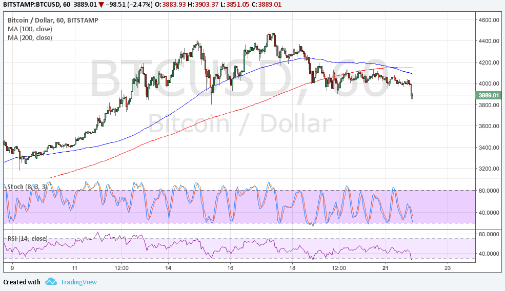 The 100 SMA crossed below the longer-term 200 SMA to show that the path of least resistance is to the downside. This means that the support is more likely to break than to hold. Note that the chart pattern is approximate $600 tall so the resulting drop could be of the same size, taking Bitcoin price to $3200.