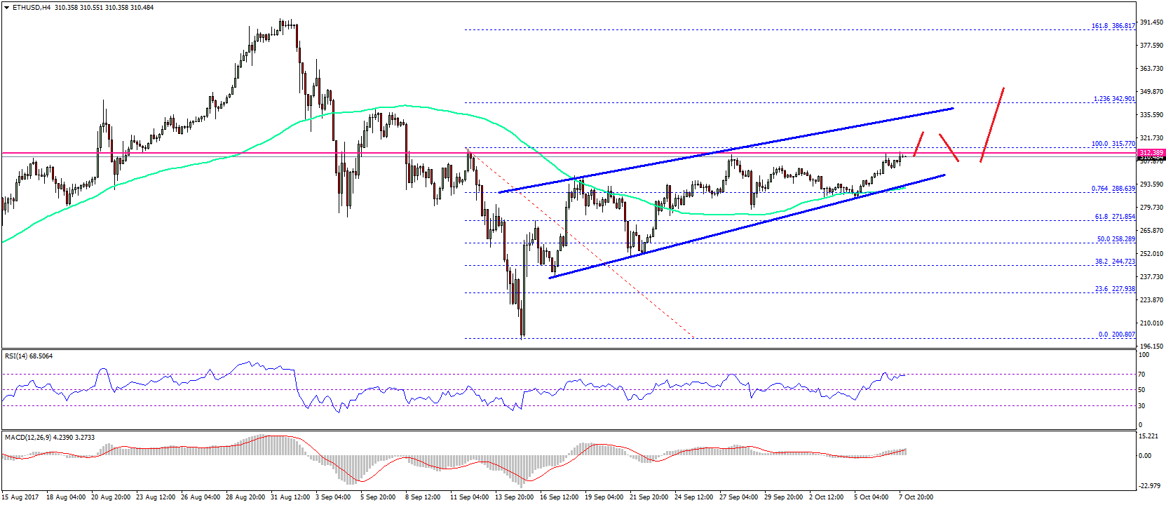 It has opened the doors for more gains and the price is likely to accelerate above the $315 high. The next resistance is around the 1.236 extension of the last decline from the $315.77 high to $200.80 low at $342. Moreover, there is a connecting resistance trend line as well at $338. On the downside, there is a major bullish trend line forming with support at $294 on the 4-hours chart of ETH/USD. As long as the pair is above the support at $294 and the 100 simple moving average (H4), there can be more gains.