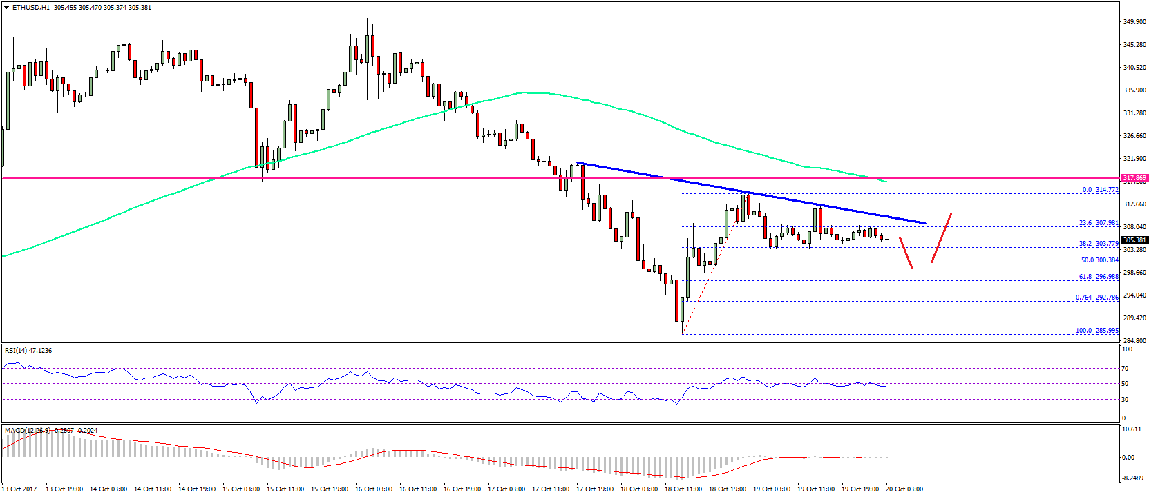 - There is a new connecting bearish trend line forming with resistance near $308 on the hourly chart of ETH/USD (data feed via SimpleFX).