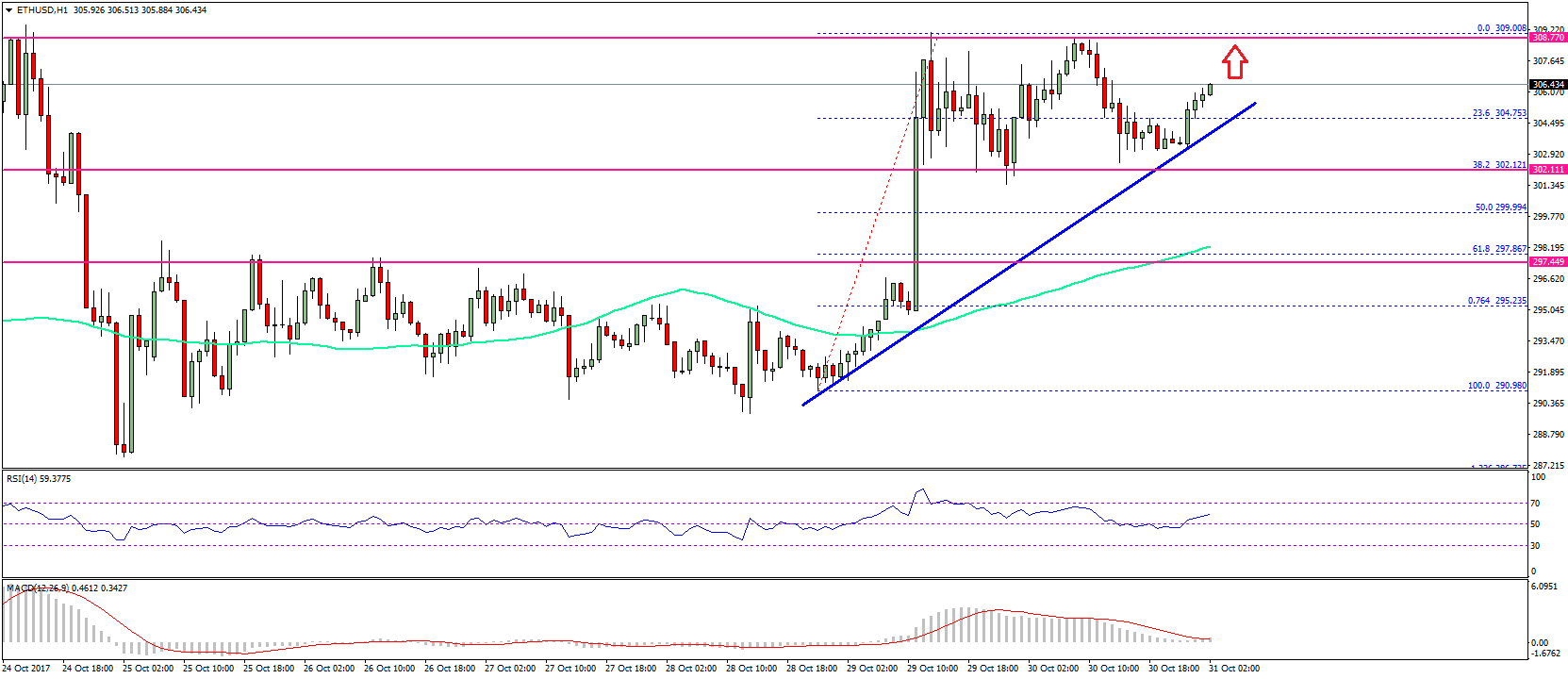 Moreover, yesterday’s highlighted short-term bullish trend line with current support at $304 also provided support on the hourly chart of ETH/USD. It acted as a decent buy zone near $302 and prevented further downsides. Besides, the 38.2% Fib retracement level of the last leg up from the $290.98 low to $309.00 high also acted as a support. The pair is once again moving higher and already trading above $304. However, it faces a monster resistance near $309. The stated $309 level prevented further gains on many occasions and it might continue to act as a hurdle.