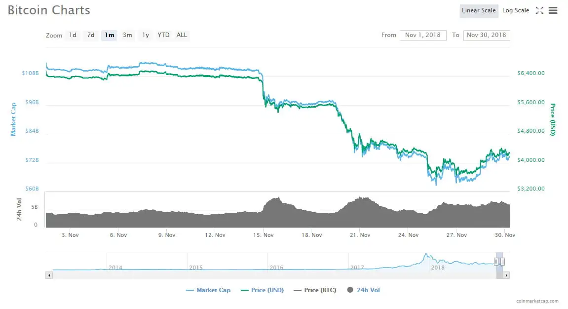 Starting out at over $6,500 on November 1st Bitcoin plummeted around 35% to end the month at around $4,280 yesterday according to figures from Coinmarketcap. Naturally different indexes will have slightly different prices and taking time zones into consideration could make things look worse as BTC plunged again a few hours ago, still technically November in the US.