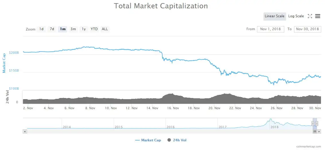 Bitcoin was not the only crypto in pain during November; the all took a massive hit, with Ethereum coming off worse than some of its brethren. Dumping almost 42% ETH fell from $200 to $117 last month. From high to low things look even worse with a fall of 53% from $220 to $103.