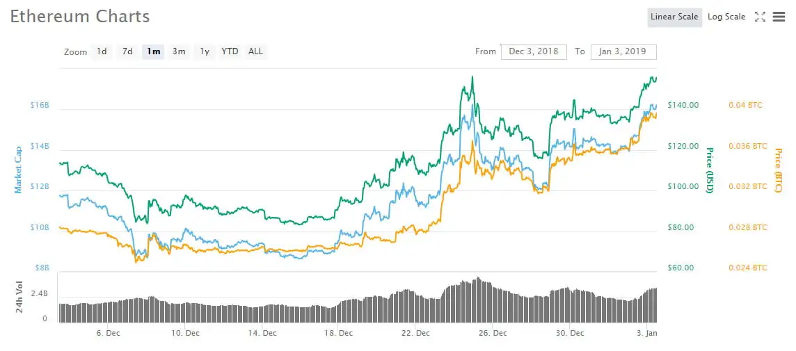 Since the bleakest day of the year for crypto things have gone better for Ethereum as it has made a recovery of over 85% to its current levels. This surge in price has taken ETH to $155 in just 18 days and enabled it to retake second position from XRP yesterday. At the time of writing Ethereum has increased that gap to over $1 billion in market capitalization over XRP. Since the low ETH market cap has almost doubled to $16.2 billion where it currently stands.
