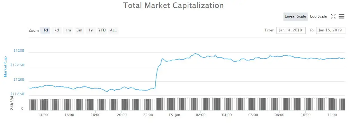 A minor rebound has occurred over night which has pushed total market capitalization back over $120 billion. It is nothing to get excited about though as things are still way down on the week and the fifteen day old year.
