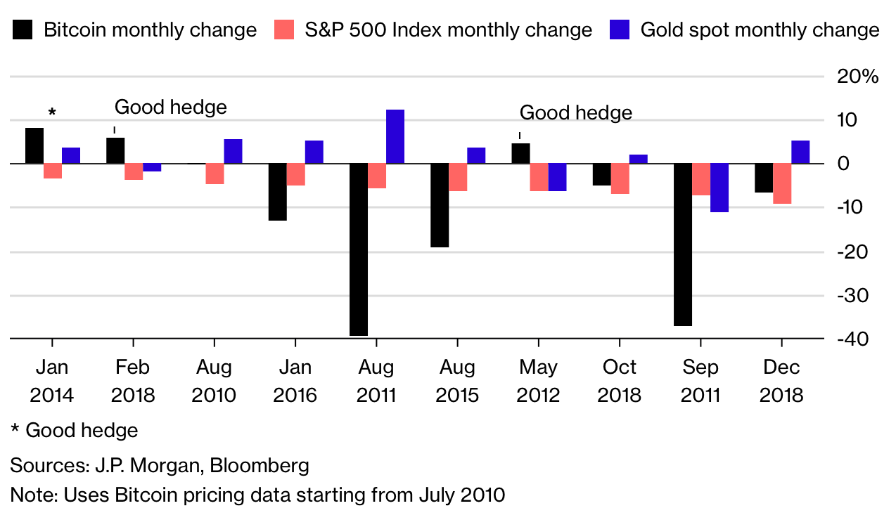 The head of JPMorgan’s cross-asset management unit told Bloomberg that gold was a better hedge than Bitcoin since July 2010. While the precious metal proved to be a safer haven six times for the S&P 500 10-worst months, bitcoin posted positive returns on only three occasions.