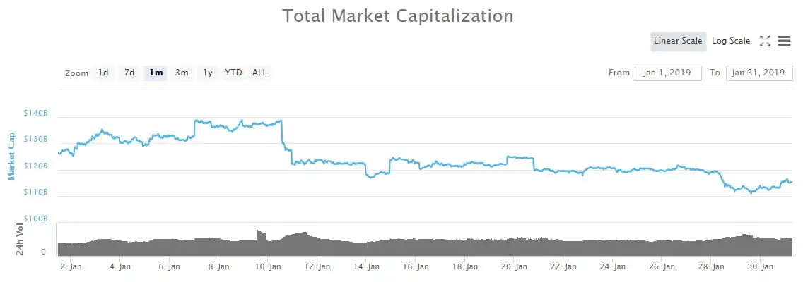 Following the lowest month for over a year in December markets started to recover over the New Year. Progress continued steadily until January 10th by which time markets had recovered almost 40%. The bulls did not stay around for long though as a huge dump wiped out $16 billion in two days sending markets back down towards their lowest levels again. Over the month markets lost 8.6% ending at just over $115 billion total capitalization.