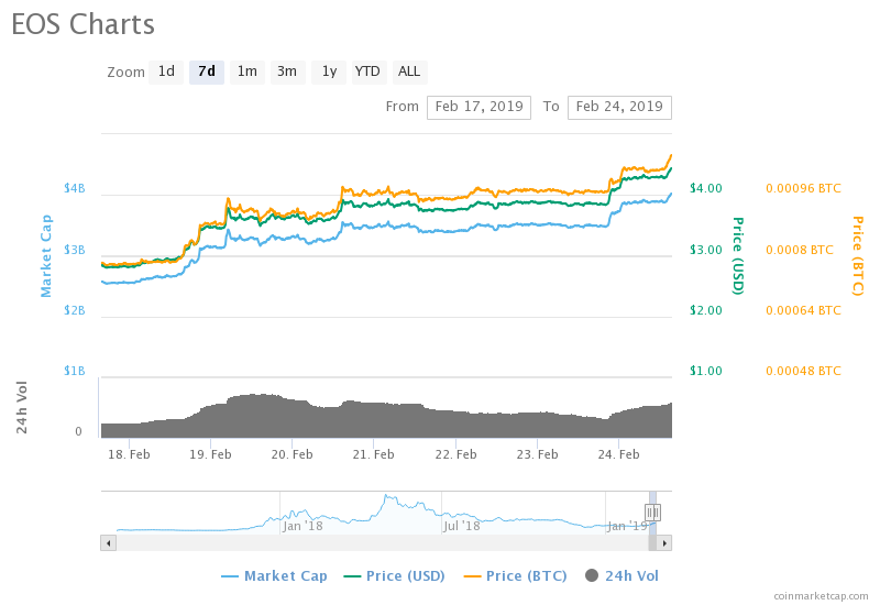 Soon after Tapatalk announced its partnership with EOS, the latter’s market capitalization reached up to $4.022 billion, up 18% since the day of the announcement.
