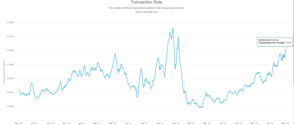 “Volumes have subsided somewhat from the late February excitement and volatility remains subdued. Transactions on the world’s favorite blockchain however, have seen yet another significant uptick as Bitcoin now processes an average of 4.05 transactions per second,” he wrote while referencing the below chart.