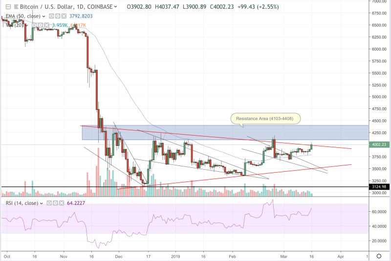 The bitcoin rally follows an overstretched stable action since February 25. The cryptocurrency’s significant levels remain unchanged as it traded inside a $200-range for almost two weeks. Before that, bitcoin failed when it came to piercing through key resistance areas. At the same time, the cryptocurrency received equally stronger support from bulls on every downside correction. Have a look at this chart to understand further.