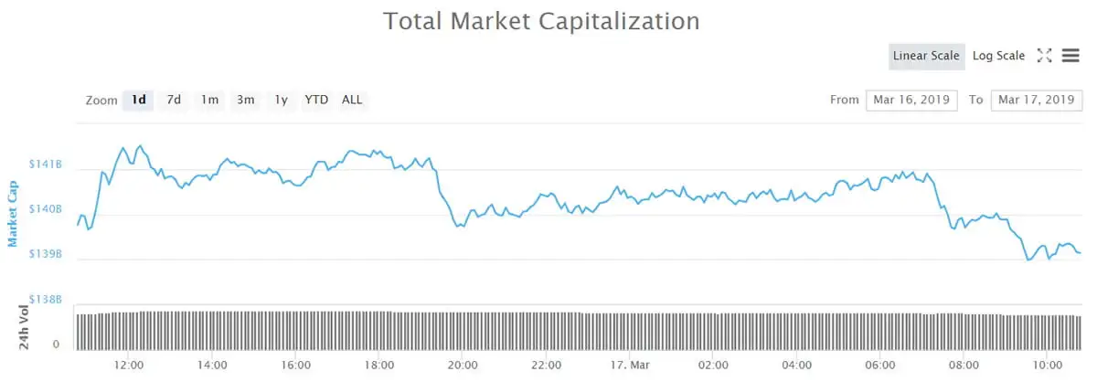 Total crypto market capitalization has cooled off and dropped back below $140 billion, losing a couple of percent from Saturday’s rally. Volume is back to $30 million and markets could see further losses if day traders continue to sell off their altcoins.