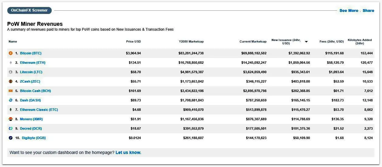 The cryptocurrency data portal published a new screener this Monday which outlined the revenues paid to miners for top proof-of-work coins. The Screener based its figures on new issuance and transaction fees, eventually finding that Bitcoin produced the maximum output among all the PoW assets, issuing $7.392 million worth of bitcoin tokens every 24 hours and distributing over $115,000 in mining fees.