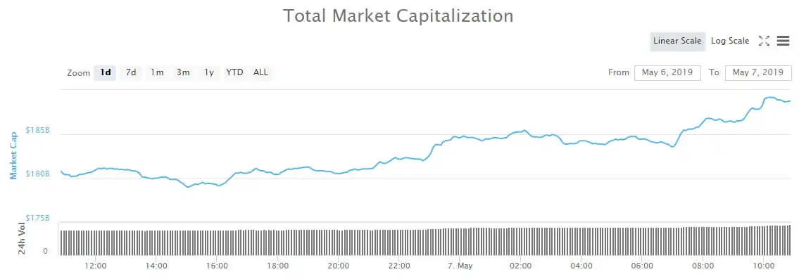 Total crypto market capitalization surged to a 2019 high of $189 billion a couple of hours ago. Over $9 billion flooded back into markets, largely due to big moves by Ethereum and Bitcoin. Daily volume has surged to $55 billion and markets have made 12 percent since the same time last week.