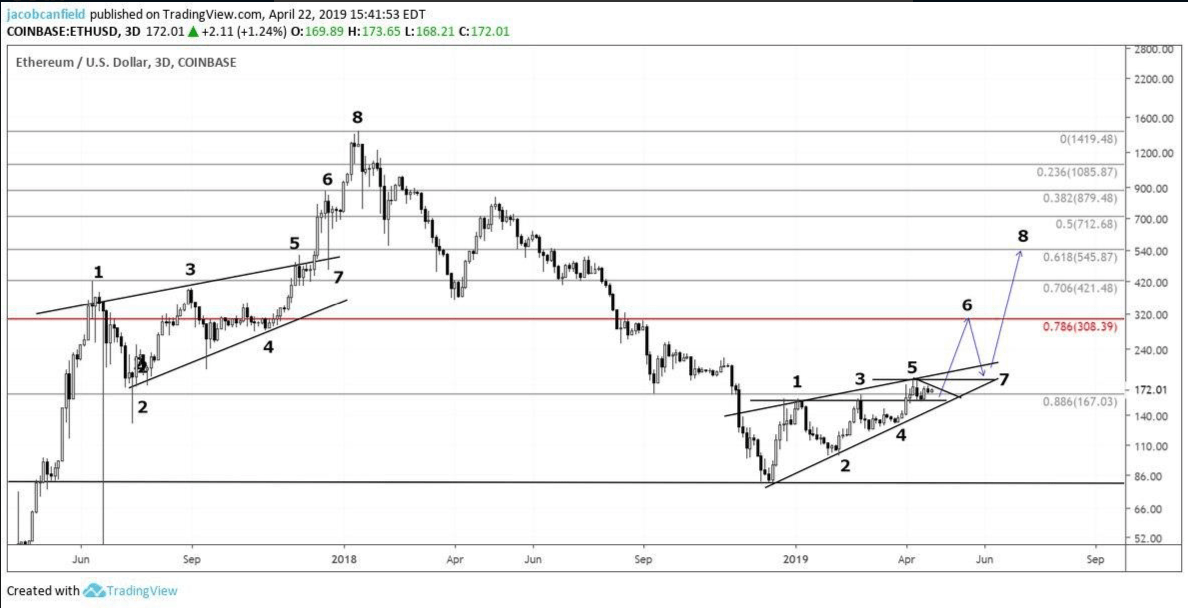 Jacob Canfield, the co-founder of SignalProfits.com, predicted Ether at circa $546 based on the asset’s historical price moves dating back to 2017. The analyst noted that the Ether price is trending inside a Rising Channel that looked strikingly similar to a channel that formed between June 2017 and early December 2017. The ETH/USD rate in 2017 posted 186.58 percent gains inside the Rising Channel. The pair later broke out and settled its all-time high of $1,419.48 on US-based exchange Coinbase, as shown in the chart below.