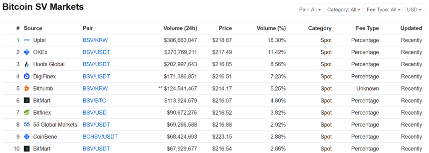 Data shows Upbit, Korea’s largest exchange, makes up the majority of the volume, at 16%. This is closely followed by OkEx and Huobi, which when combined account for a third of the total volume. This currently stands at $2.2 billion – another all-time-high for Bitcoin SV.