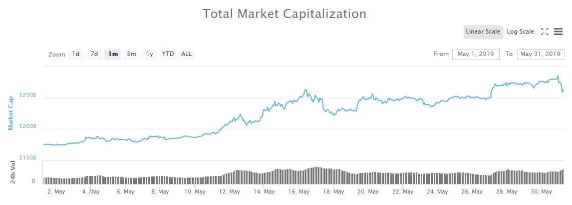 Ethereum performance equaled that of Bitcoin has it pumped 60 percent to end the month at $260. Gains previously had been very hard to come by for ETH but May has finally seen a resurgence as it returned to highs not seen since August 2018.