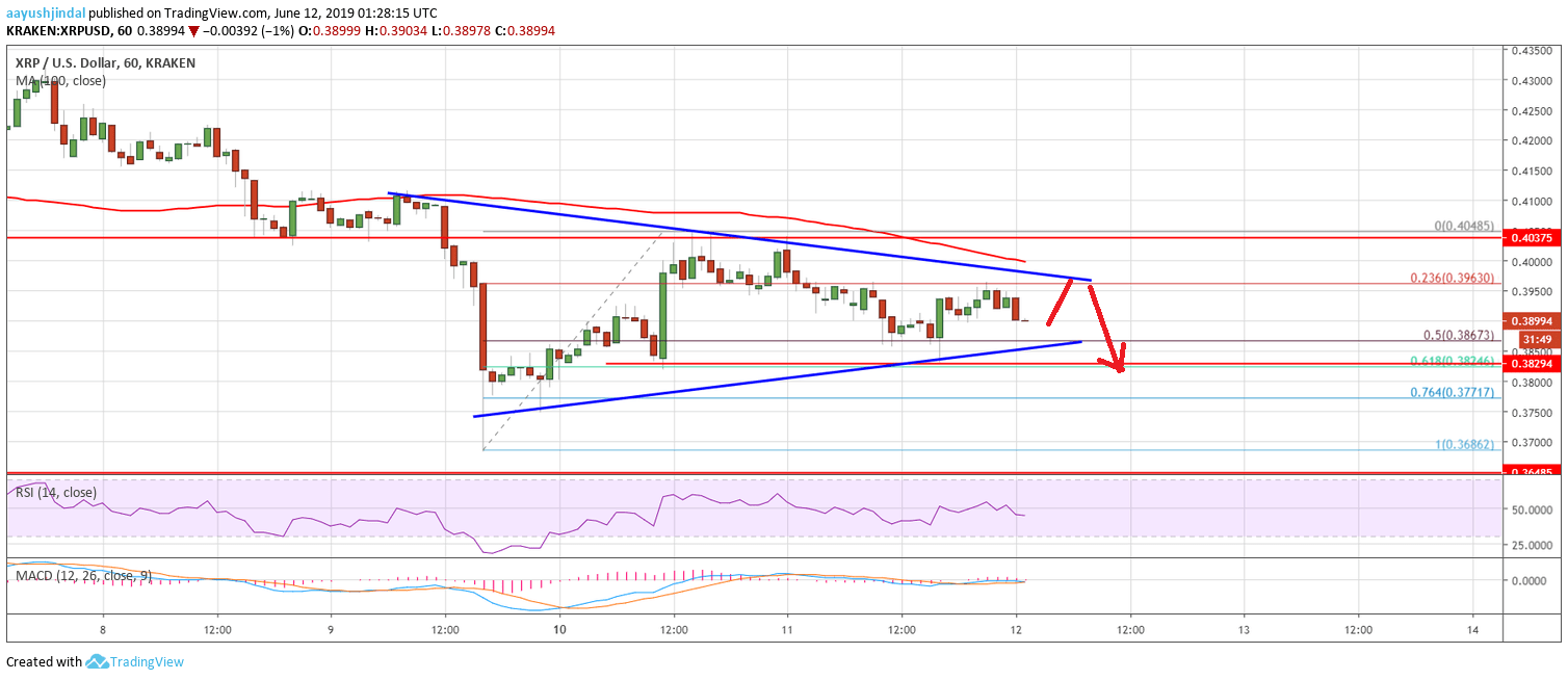 There was a downward move below the $0.4000 level and the 23.6% Fib retracement level of the recent wave from the $0.3686 swing low to $0.4048 high. Ripple price even broke the $0.3900 level and spiked towards $0.3800. It seems like the 50% Fib retracement level of the recent wave from the $0.3686 swing low to $0.4048 high is currently acting as a support. Moreover, there is a key contracting triangle forming with resistance near $0.3960 on the hourly chart of the XRP/USD pair.