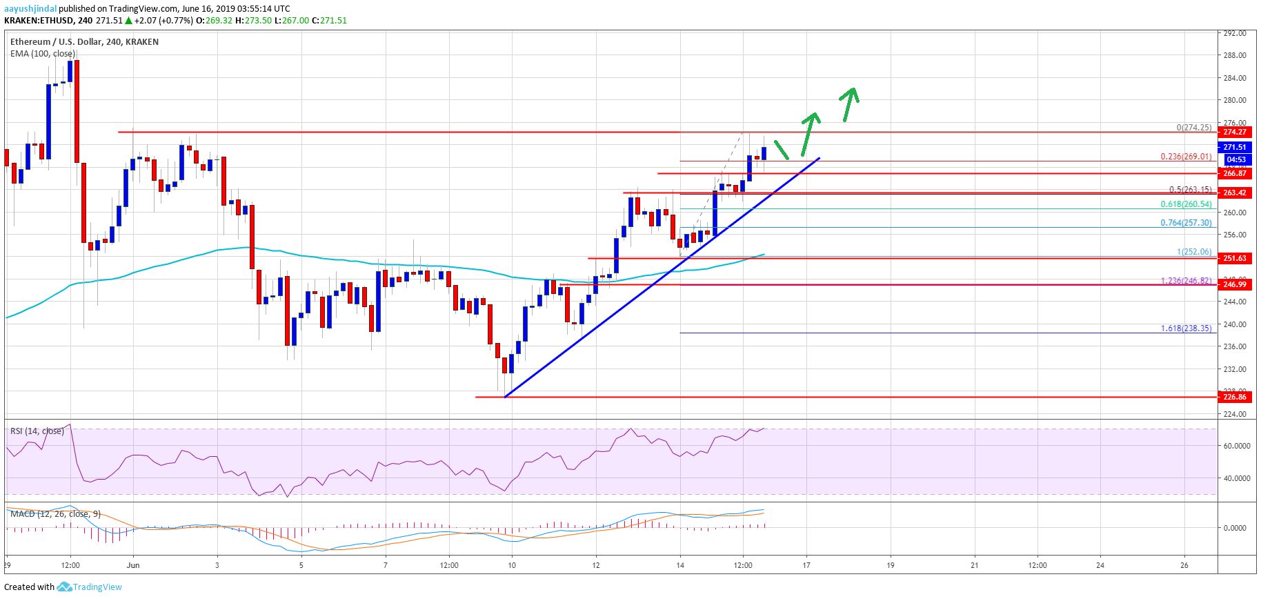 A swing high was formed at $274.25 and the price is currently trading with a positive bias. An initial support is near the 23.6% Fib retracement level of the last wave from the $252 low to $274 swing high. Moreover, there is a major bullish trend line forming with support at $265 on the 4-hours chart of ETH/USD. If there is a downside break below the trend line, the price could even break the $262 support area. An intermediate support is near the 50% Fib retracement level of the last wave from the $252 low to $274 swing high.