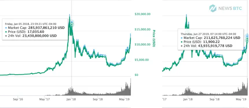 During the last bull run, trading volume peaked out at $24 billion, which means that yesterday’s fireworks almost doubled the highest point of the previous bull run – when Bitcoin took the mainstream public by storm and caused widespread FOMO that created a bubble.