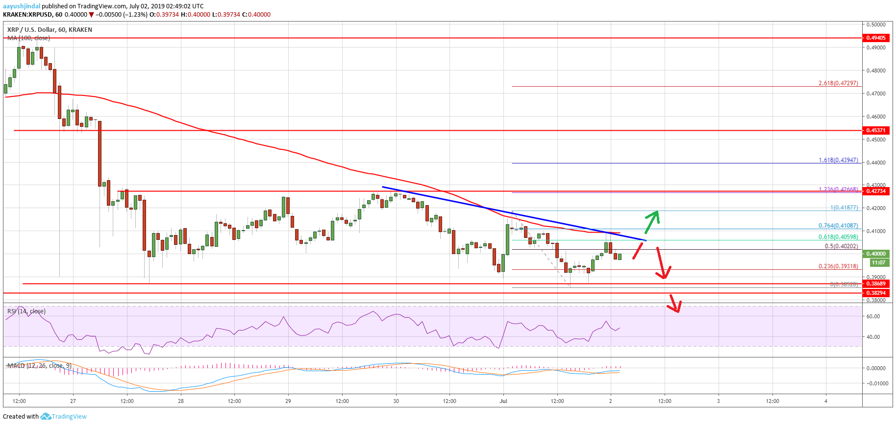 Moreover, there is a major bearish trend line forming with resistance near $0.4050 on the hourly chart of the XRP/USD pair. The 61.8% Fib retracement level of the last decline from the $0.4187 high to $0.3852 low is also acting as a strong resistance. Therefore, a successful close above the trend line and $0.4150 is needed for a fresh increase in the near term.