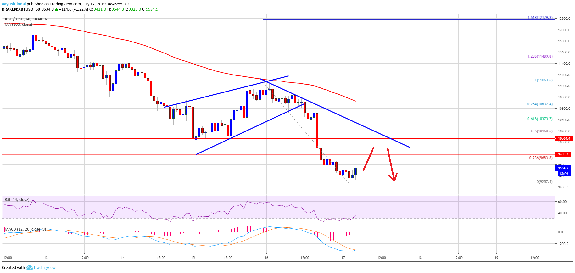 - The price traded below the key $10,000 and $9,800 support levels to enter a bearish zone.