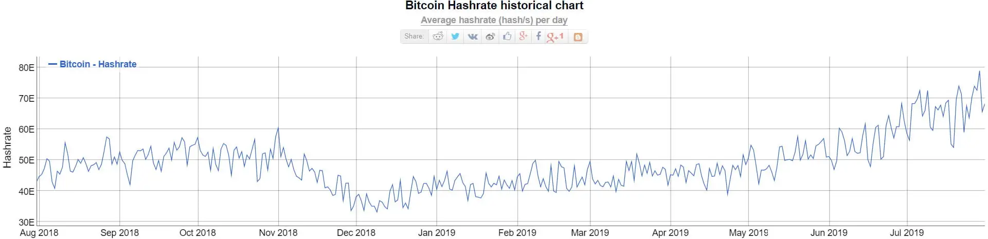 According to Bitinfocharts.com hash rate hit 78.9978 EH/s on July 29, marking a new all-time high for the network.