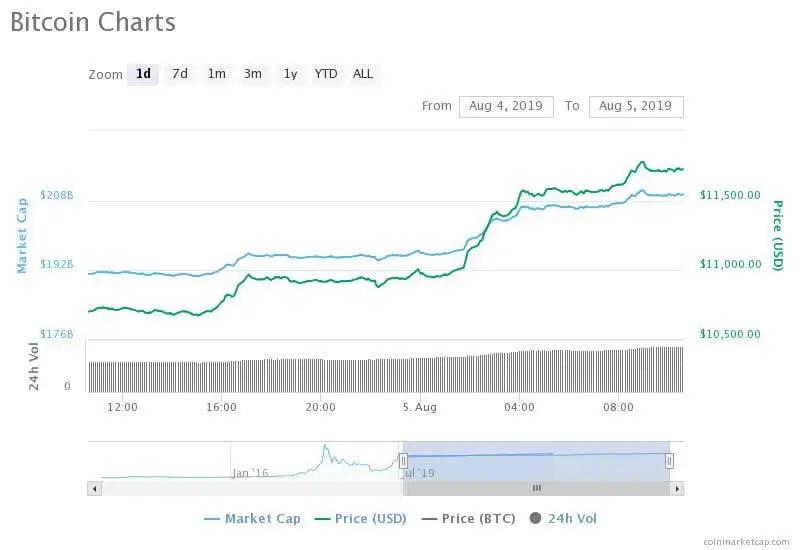 Bitcoin has not looked back since it passed the psychological $10k barrier late last week. Over the weekend it hovered just below $11k but during Asian trading this morning BTC surged almost 10 percent powering up to a high of $11,800. The move has sent prices to a 24 day high as volume surged 50 percent to over $21 billion.