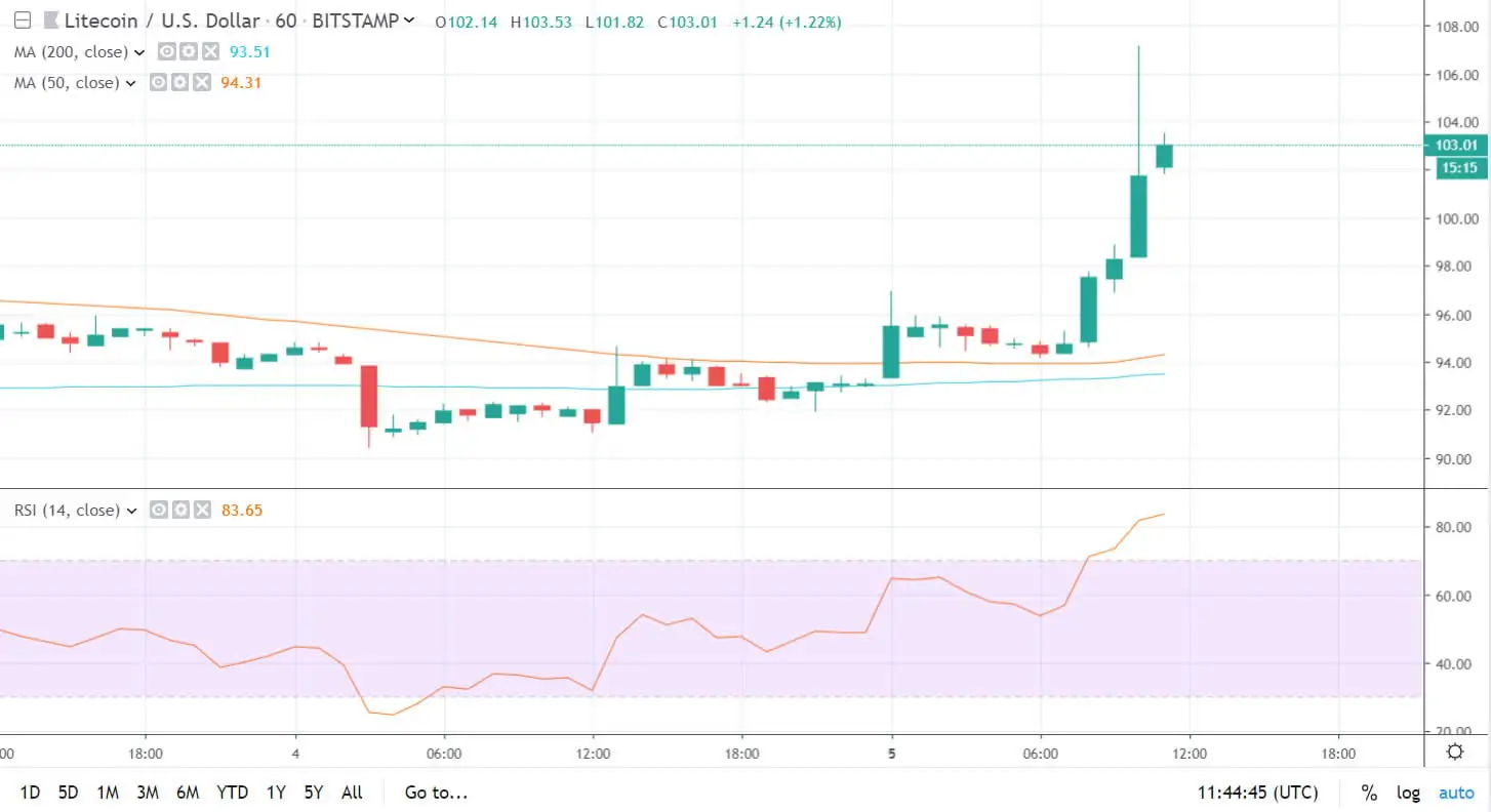 Usually price pumps happen before halving events but Litecoin has started spiking a few hours ago. From an intraday low of around $92 LTC surged through the psychological $100 barrier to top out at $107 an hour or so ago according to Tradingview. The move has added 14 percent to Litecoin prices over the past 24 hours.