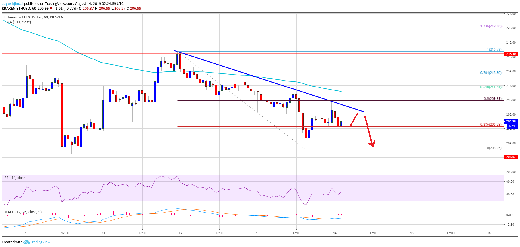 In the past few sessions, there was a steady decline in ETH price from the $216 resistance against the US Dollar. More importantly, bitcoin price gained bearish momentum and declined towards the $10,500 bearish target (as discussed in the weekly forecast). However, Ether’s price remained above the $200 support area and no new weekly low was formed.