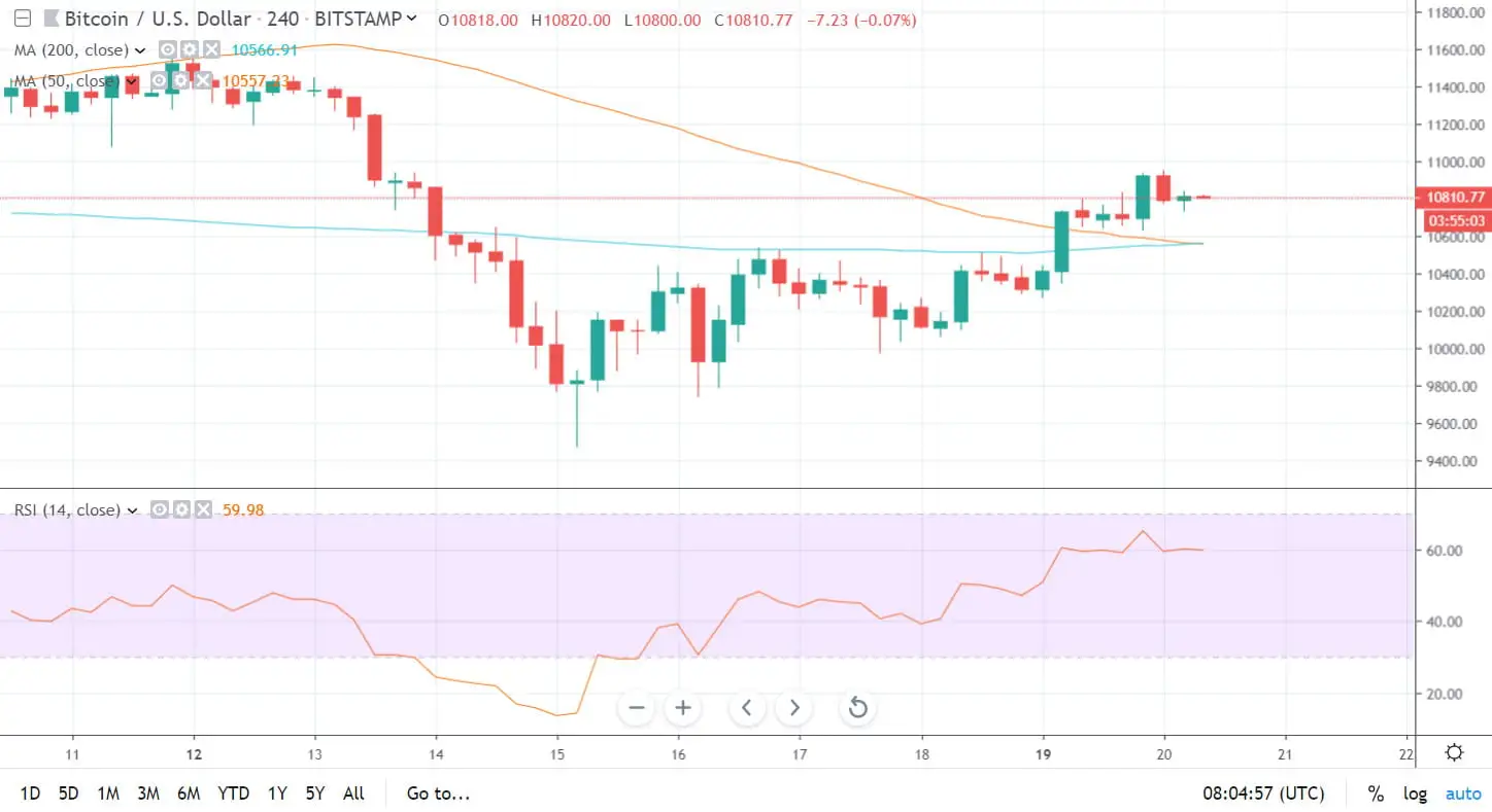 A few hours ago during Asian trading, BTC posted a weekly high of $10,950 according to Tradingview.com. The price is back at last Tuesday’s resistance turned support level and up almost 10 percent since the weekend dip. In the hours that followed there was a slight pullback to around $10,800 where Bitcoin is currently trading.