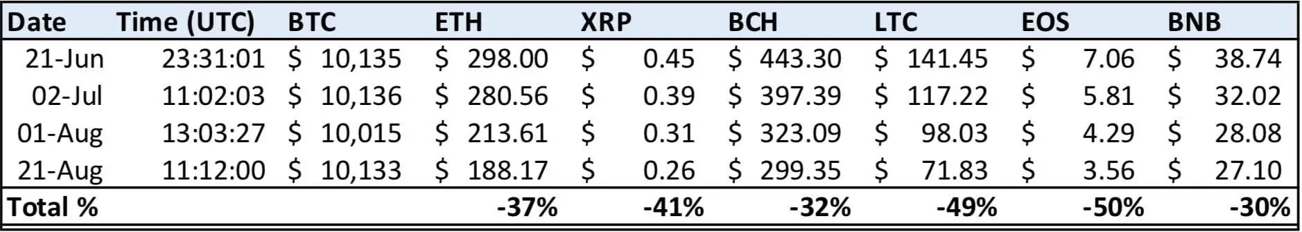“Bitcoin first hit $10K two months ago on June 21st. Since then, it has traded around this level on multiple occasions. Every time it has returned to ~$10K, major [altcoins[ have bled out a little more in the process.”