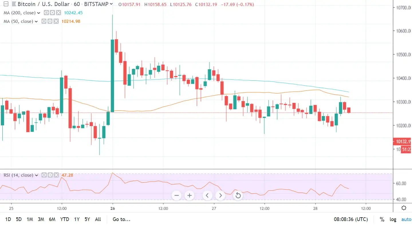 The resistance and support levels have not changed all week and remain at $10,400 on the high side with $10k then $9.8k on the low.