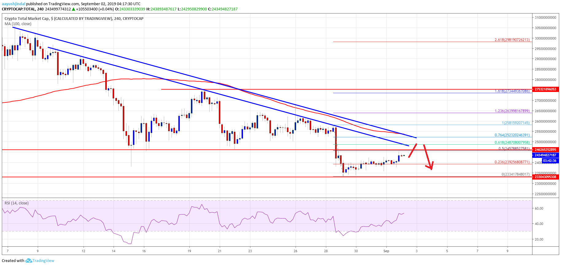 Looking at the total cryptocurrency market cap 4-hours chart, there a significant decline from well above the $270.0B level. The market cap even broke the main $250.0B support area and tested the $235.0B area. It is currently correcting higher above $240.0B. However, there are many resistances near $248.0B, $250.0B, and two bearish trend lines on the same chart. Therefore, upsides are likely to remain limited in bitcoin, Ethereum, EOS, ripple, litecoin, bitcoin cash, XLM, TRX, BNB, WAN, WTC, ICX, and other altcoins in the near term.
