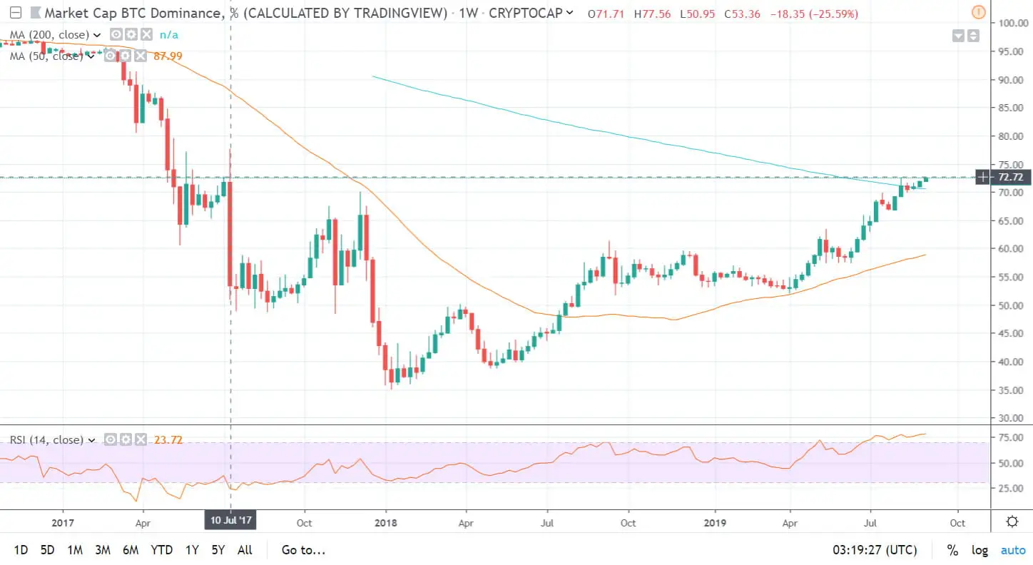 The last time Bitcoin dominance was this high was back in July 2017 when it was priced at just $2,450 with a market capitalization of $900 million. This was a spike, however, so the previous sustained period of BTC supremacy was further back in May 2017 when it fell from over 80 percent.