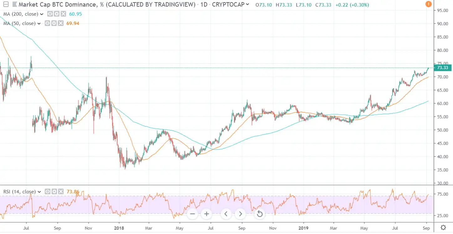 According to Tradingview.com, Bitcoin dominance has hit its highest level for over two years today. With a high of 73.3 percent the asset has not commanded this much of the market since early 2017, before any of the altcoins really took off.
