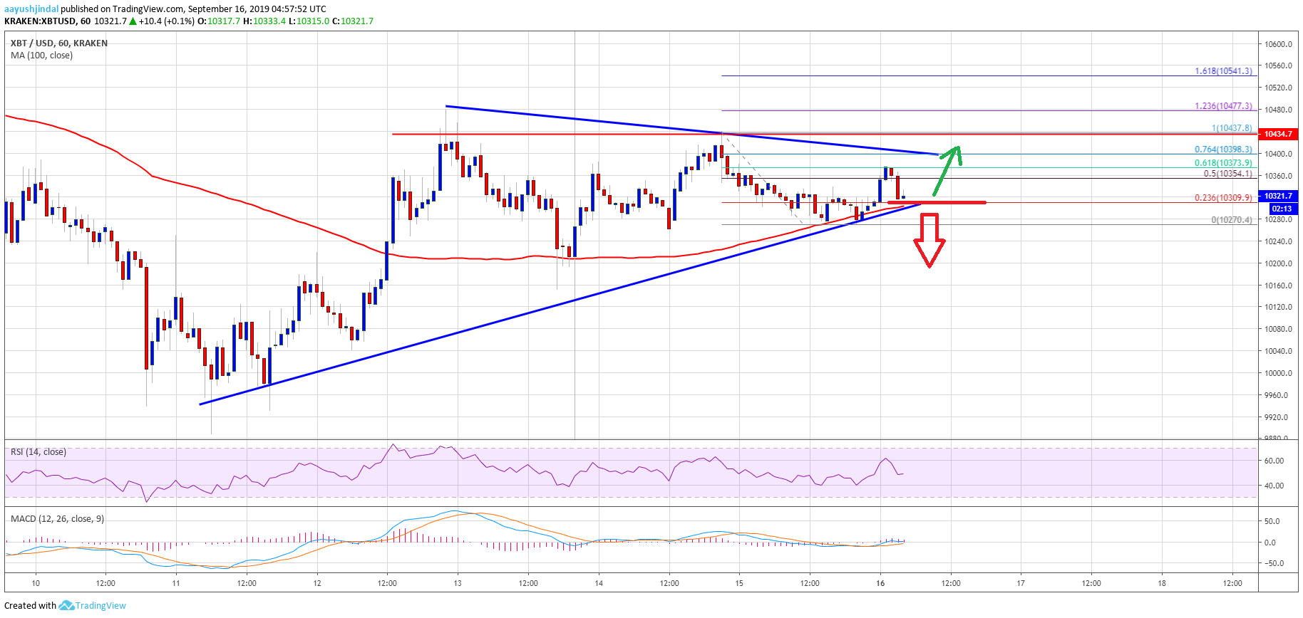 It seems like the 61.8% Fib retracement level of the recent decline from the $10,437 high to $10,270 low is acting as a hurdles. More importantly, there is a breakout pattern forming with resistance near $10,400 on the hourly chart of the BTC/USD pair. If bitcoin breaks the trend line support near $10,300 and the 100 hourly SMA, there could be a downside extension. An immediate support is near the $10,250 level, below which the price could head towards $10,000.