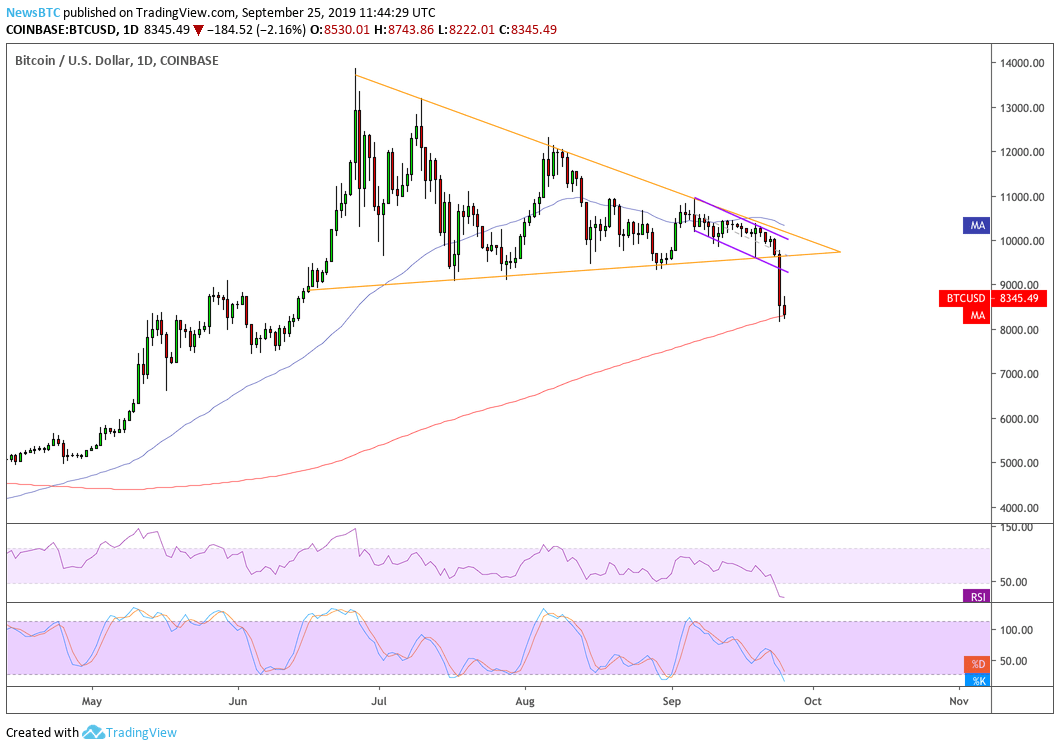 “Bitcoin has finally broken below the support line of the large descending triangle it has been carving out for months. This is a very a bearish technical pattern, and it confirms that a major top has been established. The risk is high for a rapid [descent] down to $4,000 or lower!”