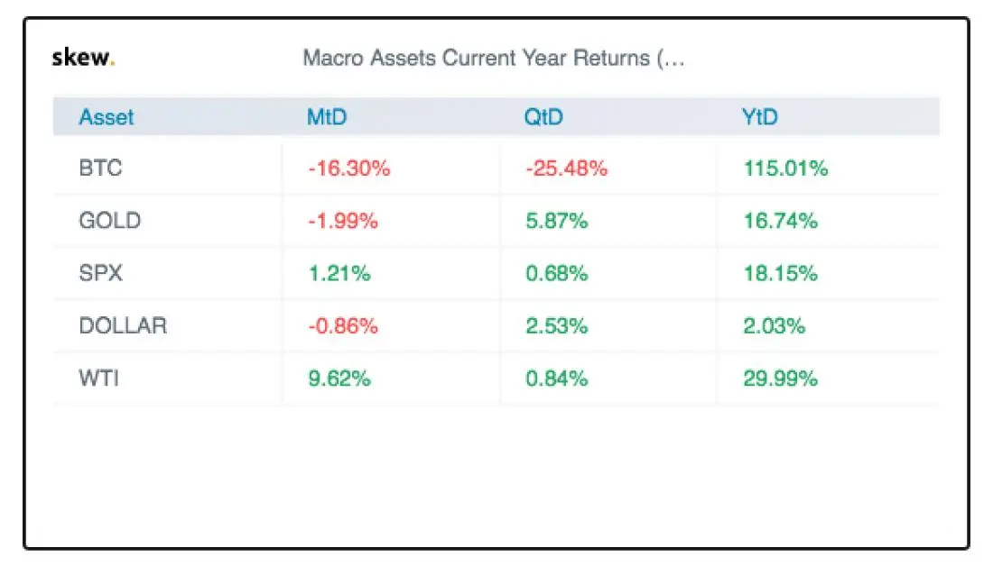 According to data provided by Skew, bitcoin’s quarterly returns were negative. The benchmark cryptocurrency dropped by 25.48 percent in Q3/2019 while its traditional rival Gold went up by 5.87 percent. The US dollar, whose health typically drives the sentiment in the gold markets, surged 2.53 percent in the same period.