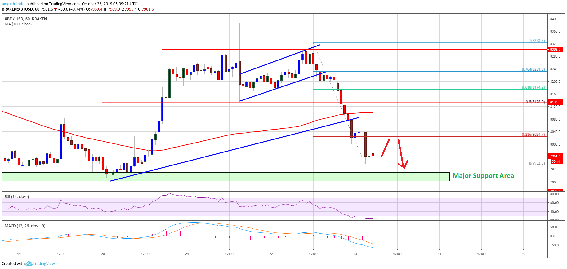 Finally, bitcoin traded below the $8,100 support area and settled below the 100 hourly simple moving average. It is now trading below the $8,000 level and a low was formed near $7,932.