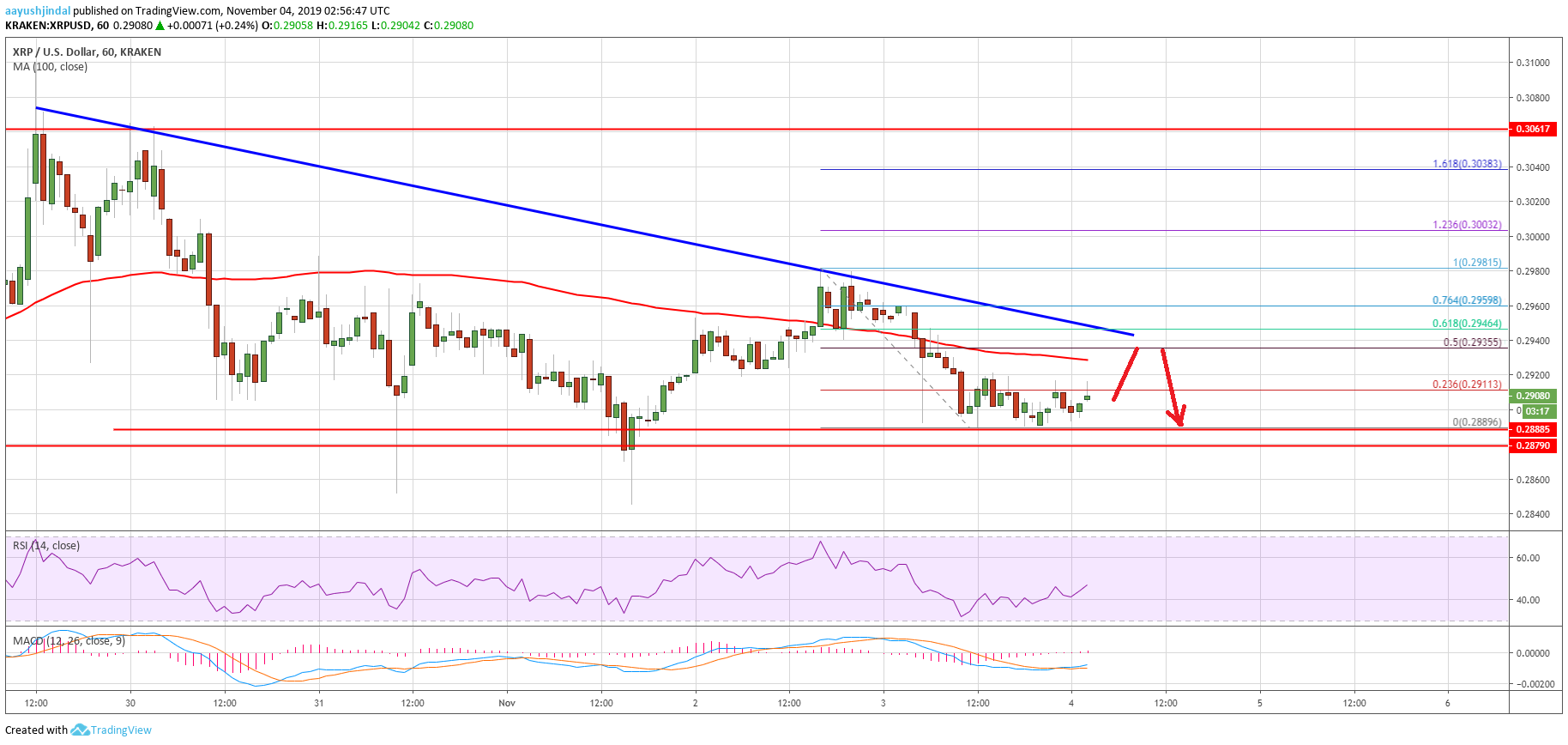More importantly, there is a major bearish trend line forming with resistance near $0.2945 on the hourly chart of the XRP/USD pair. The trend line coincides with the 61.8% Fib retracement level of the recent decline from the $0.2981 high to $0.2889 low.