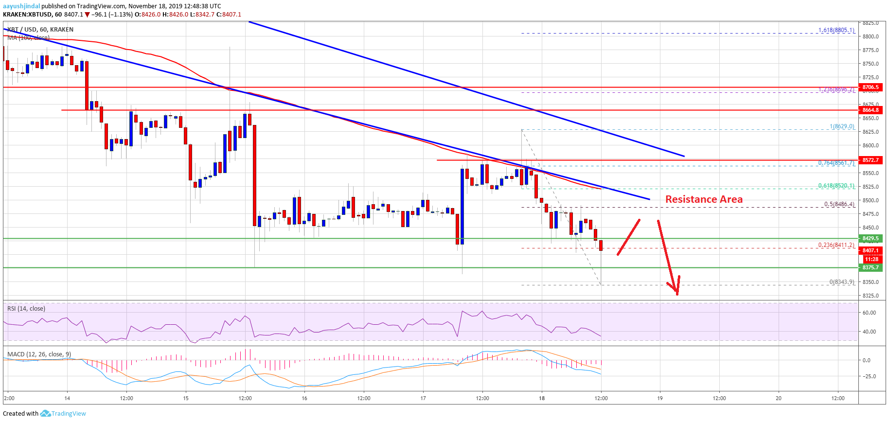 Moreover, there was a break below the $8,400 and $8,375 support levels. Finally, the price traded to a new weekly and monthly low near $8,343, plus settled well below the 100 hourly simple moving average.